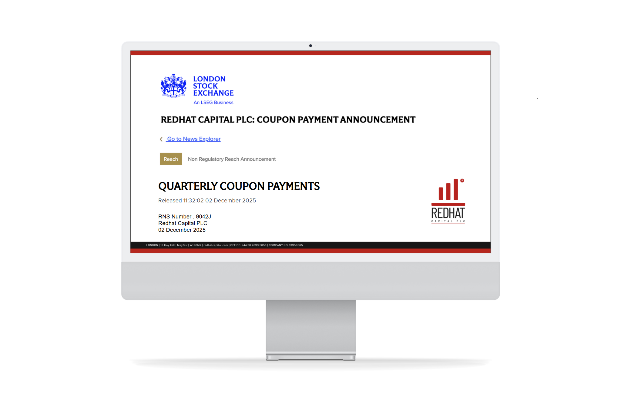 London: 2nd December 2025: Redhat Capital PLC (the “Issuer“) is pleased to announce that the interest due to Bondholders for the quarter ending 31/10/2025 in respect of the Series 2 Bonds has been paid.